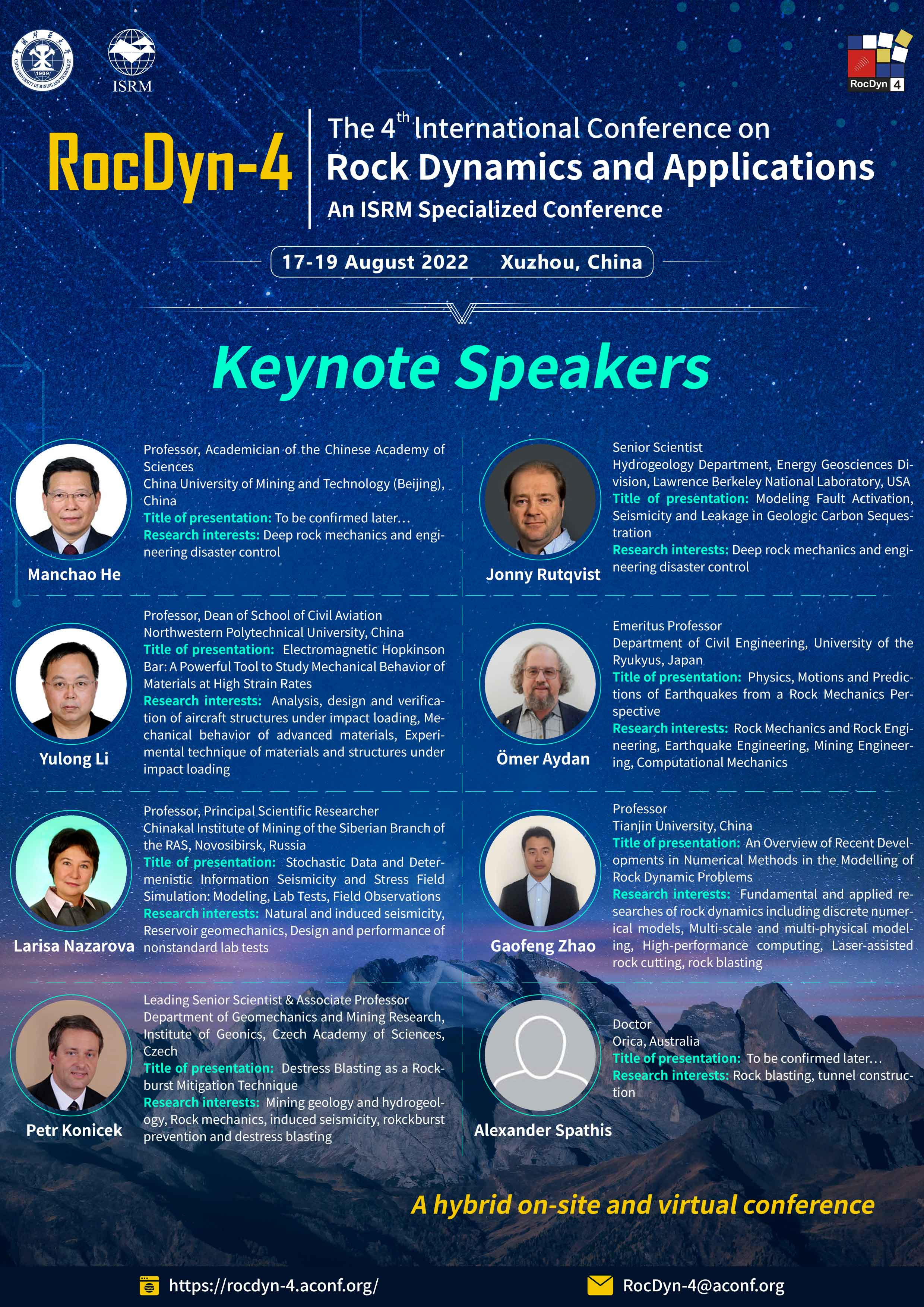 We have invited eight distinguished speakers to lead the keynote lectures and highlight some of the latest development in rock dynamic research, innovations, challenges, and future directions. Click here to download the flyer with the speakers' information.