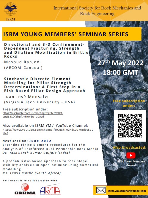 You can join using the Zoom link created for each Seminar and you can participate in the question and answers period. The Seminars will also be live-streamed to the ISRM YM's YouTube channel, where they will be stored. Click here to download the flyer.