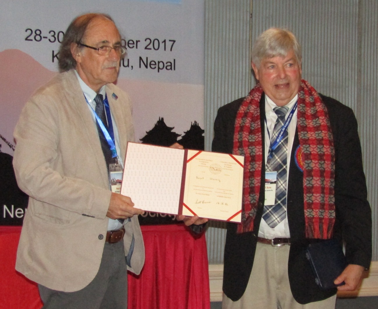 Prof. Reşat Ulusay received the 2016 Hans Cloos Medal Award of the IAEGThe ISRM President-elect Prof. Reşat Ulusay received the 2016 Hans Cloos Medal Award for his excellent contribution to the development of engineering geology. The Hans-Cloos Medal is the senior award presented by International Association of Engineering Geology and the Environment - IAEG, and is given to an engineering geologist of outstanding merit of international repute who has made a major contribution to engineering geology. The award took place in Nepal, on 28 November 2017, in the 2017 IAEG 11th Asian Regional Conference (ARC11).  Following the award ceremony, Prof. Ulusay gave the 2106 Hans Cloos Lecture entitled "Geo-engineering aspects on the structural stability and protection of historical man-made rock structures: An overview of Cappadocia Region (Turkey) in the UNESCO's World Heritage List". The full paper of the 2016 Hans Cloos Lecture is available online now and will be published in the Bulletin of Engineering Geology and the Environment in 2018. Go to the top of the Newsletter