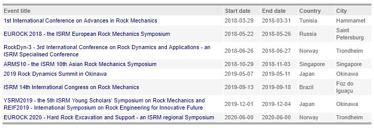 The award will be given during the 2018 ISRM International Symposium in Singapore where the winner will be invited to deliver the Rocha Lecture. The Rocha Medal has been awarded annually by the ISRM, since 1982, for an outstanding doctoral thesis in rock mechanics or rock engineering, to honour the memory of Past President Manuel Rocha while stimulating researchers. Up to two runner-up certificates may also be awarded. Click here to go to the Rocha Medal page. Go to the top of the Newsletter |